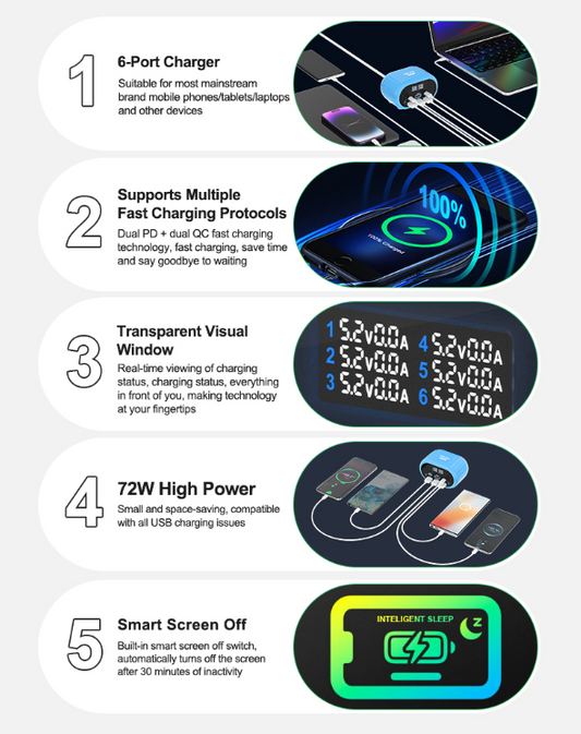 Relife RL-309U Blue USB Charger Relife RL-309U 72W Dual PD + Dual QC Smart Fast Charger Support Multiple Fast Charging Protocols Features: RL-309U 72W smart fast charging, high-efficiency new...