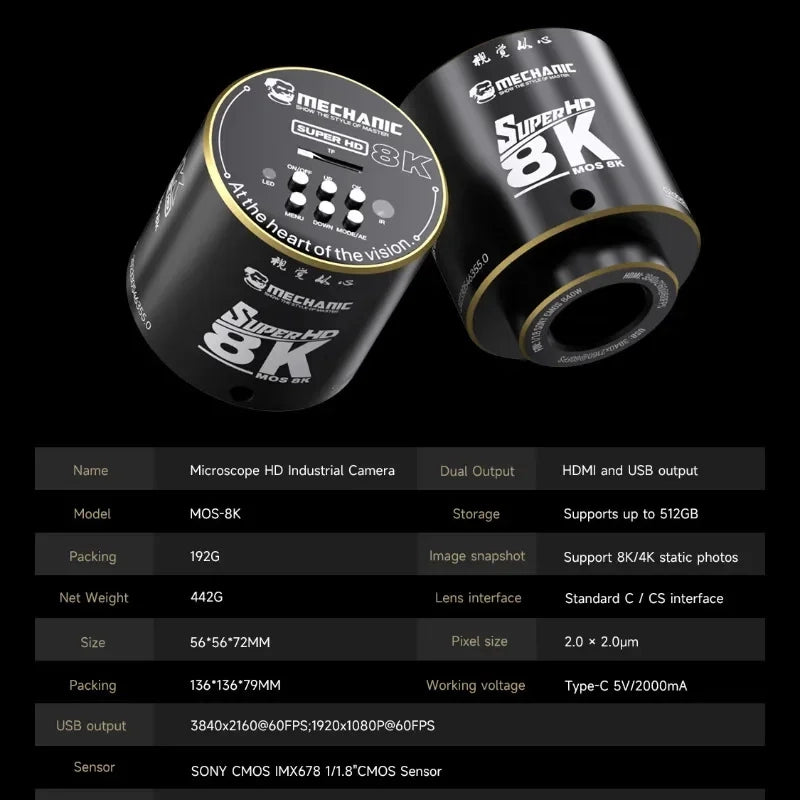 Mechanic MOS-8K Ultra HD 8K Industrial Camera uses SONY CMOS IMX678 1/1.8" CMOS Sensor, can be used with most trinocular microscopes or C/CS C-mount adapters for mobile phone repair or other electronic precision repair. Supports 8K/4K still photos, 8K@20FPS/4K@60FPS and 1080P video output, suitable for mobile phone repair competitions and mobile phone repair shops.