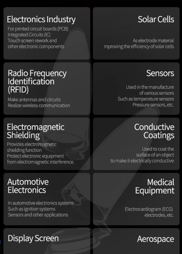 - Widely used: Electronics Industry/Solar Cells/Radio Frequency ldentification/Sensors/Electromagnetic Shielding/Conductive Coatings/Automotive Electronics/Medical Equipment/Display Screen