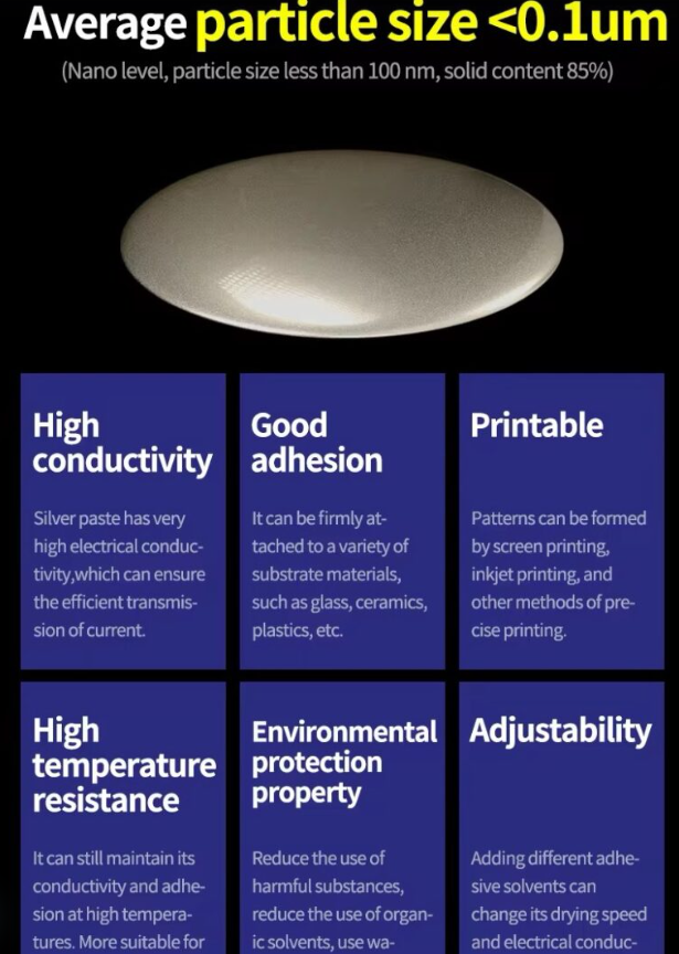 - Using Nano silver powder, Average particle size <0.1µm (Nano level, particle size less than 100nm, solid content 85%)