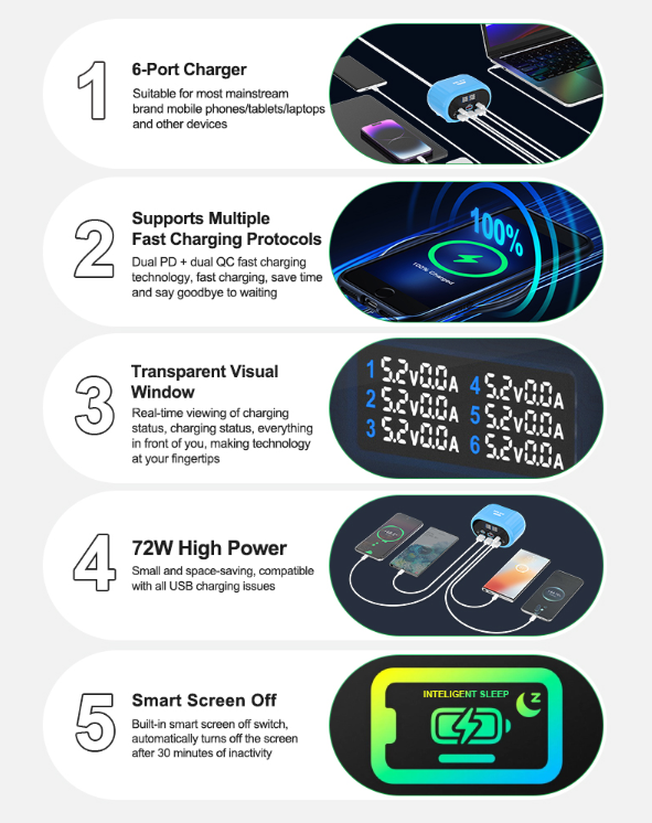 72W high power, suitable for home/office, small and space-saving, compatible with all USB charging issues