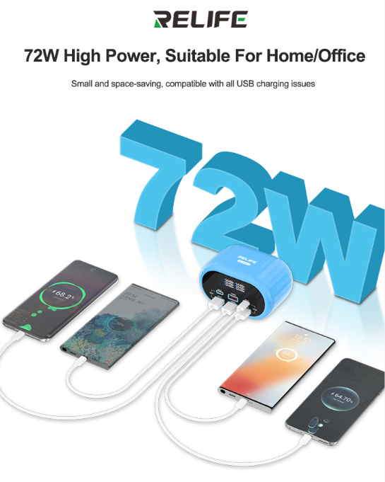 Relife RL-309U Blue USB Charger Relife RL-309U 72W Dual PD + Dual QC Smart Fast Charger Support Multiple Fast Charging Protocols Features: RL-309U 72W smart fast charging, high-efficiency new...