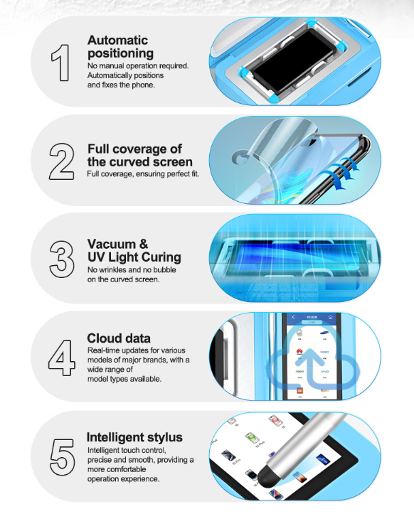 .Intelligent vacuum & UV light curing, 30 high-power UV LEDs formaximum efficiency100% light utilization ultra-fastcuring