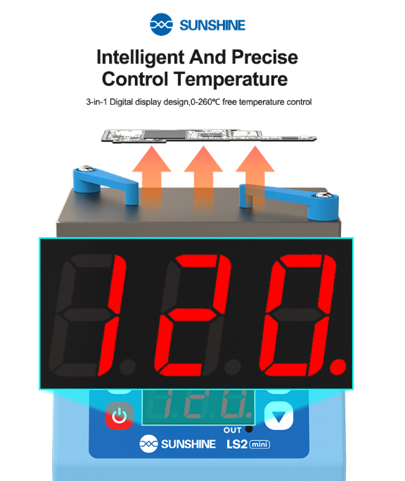 The SUNSHINE LS2 Mini is a compact preheating platform designed for various electronic repair and assembly tasks. Its precise temperature control and uniform heating make it suitable for applications such as layering, tinning, lamination, and glue removal.